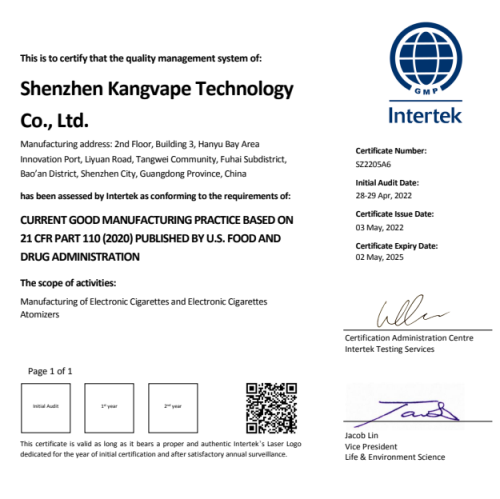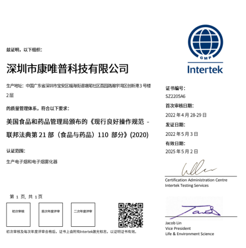 本文來源:驗廠之家網 - 祝賀深圳市康唯普科技有限公司2022年一次性成功通過電子煙GMP 110認證