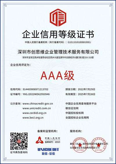 多年來深圳市創(chuàng)思維企業(yè)管理技術(shù)服務(wù)有限公司始終秉承“信譽第一、服務(wù)至上”的企業(yè)宗旨,以打造“高信用、高資信、高品牌”作為企業(yè)發(fā)展戰(zhàn)略目標,堅持“質(zhì)量第一、客戶至上”的經(jīng)營理念,不斷全面提升企業(yè)資信和服務(wù)質(zhì)量,繼續(xù)堅守匠心發(fā)展,積極推行科學嚴謹?shù)馁|(zhì)量管理體系,踐行企業(yè)擔當,為顧客創(chuàng)造最大價值。