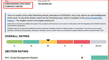本文來源:驗廠之家網 - 祝賀越南工廠GREENWORKS (THAI BINH) COMPANY LIMITED格力博 2025年一次性成功通過BSCI驗廠