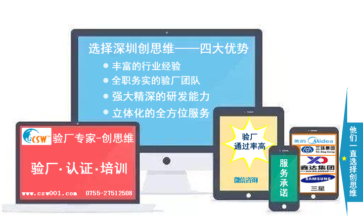 CSW創思維驗廠之家網專業從事客戶驗廠、認證咨詢、輔導培訓,價格公道,服務優良,秉承創新、高效、專業、務實企業精神。“咨詢+輔導+考勤"”一站式服務保姆式輔導,全方位實時跟蹤,多年來成功幫助上萬家企業順利通過驗廠,在行業中有口皆碑!