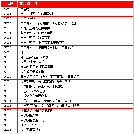 利豐驗廠零容忍違規(guī)事件是指如果預(yù)防這些違規(guī)事件的內(nèi)部系統(tǒng)沒有被理解、建立和維持的情況下能夠作為供應(yīng)商商業(yè)經(jīng)營運作一部分而發(fā)生的事項技術(shù)支持驗廠創(chuàng)思維。這些違規(guī)事件對利豐和其客戶來說是惡名昭著的和不能接受的。