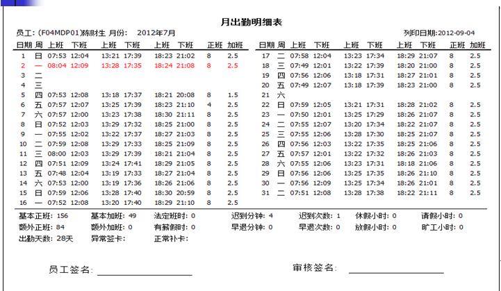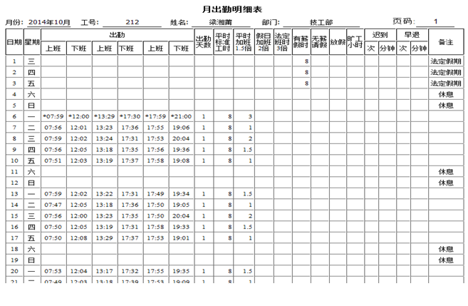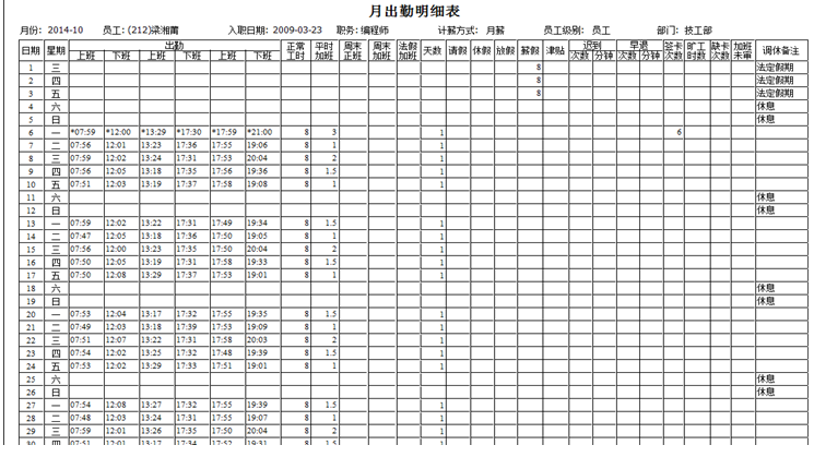 月出勤記錄--按每日出勤記錄按考勤規(guī)則條件統(tǒng)計(jì)月出勤數(shù)據(jù)資料。按結(jié)果去判斷是全勤獎(jiǎng),基本正班、加班、額外正班、加班等計(jì)薪數(shù)據(jù)。