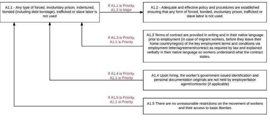 以下一項或多項為真: 1. 未經合理通知而離職的罰款超過基本工資總額的3個月 2. 在給予合理通知的情況下,工人被限制自愿終止雇傭關系或以其他方式受到處罰。 3. A1.3、A1.4或A1.5中的優先項目 4. 存在非自愿勞動(上述情況或重大不符合項除外) |